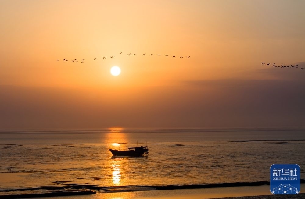 1月1日,在位于江蘇鹽城的中國黃(渤)海候鳥棲息地(第一期)核心區(qū)域東臺條子泥海濱,鳥兒迎著朝霞飛翔(1月1日攝,無人機(jī)照片)。新華社發(fā) (孫家錄 攝)