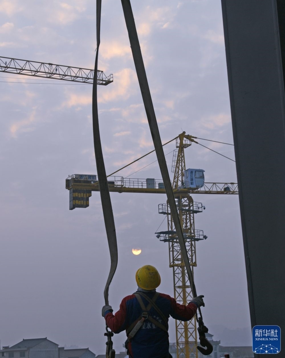 1月1日,工人迎著朝陽在浙江省杭溫高鐵臺州市仙居站項(xiàng)目施工現(xiàn)場進(jìn)行施工作業(yè)。新華社發(fā)(王華斌 攝)