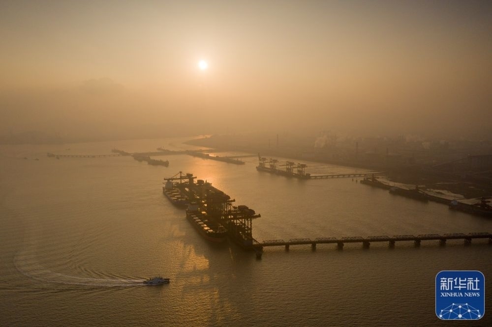 1月1日,在新年第一縷晨光里,浙江省寧波舟山港北侖港區(qū)礦石碼頭生產(chǎn)一派繁忙(無人機(jī)照片)。新華社發(fā)(蔣曉東 攝)