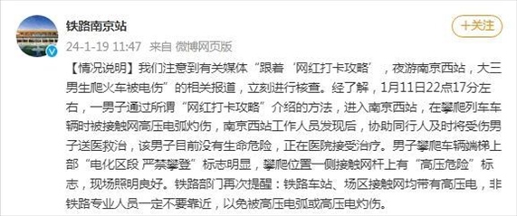 ·南京站回應(yīng)“大學(xué)生爬火車打卡被燒傷進(jìn)ICU”:男子無生命危險(xiǎn),接觸網(wǎng)均有高壓電非專業(yè)人員不要靠近。