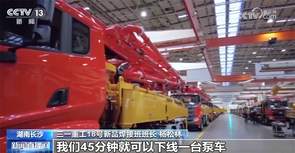 三一重工18號新品焊接班班長 楊松林:大家好,我是新品焊接班班長楊松林。我們工廠主要是生產(chǎn)泵車,看,就是我身后的這個(gè)大家伙。我們45分鐘就可以下線一臺泵車。