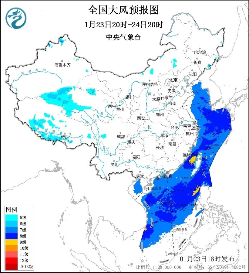 1月24日20時(shí)至25日20時(shí),青海北部和西部、福建沿海等地部分地區(qū)有5~6級、陣風(fēng)7級的大風(fēng);臺灣海峽、巴士海峽、南海大部海域?qū)⒂?~8級、陣風(fēng)9~10級的大風(fēng),其中南海西南部的部分海域風(fēng)力可達(dá)9級、陣風(fēng)10級。