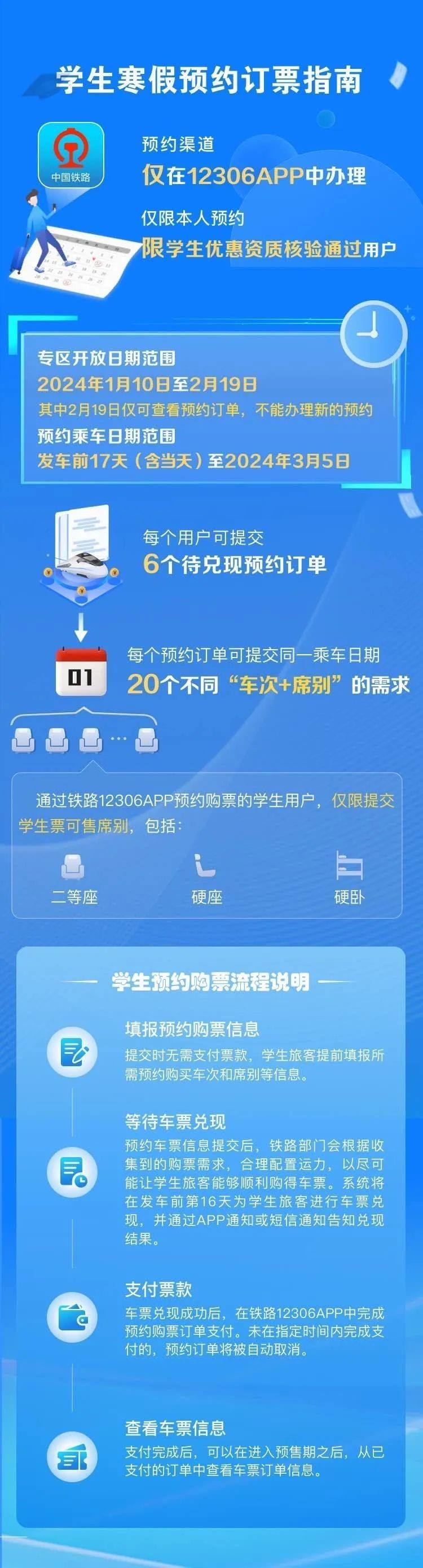 學(xué)生、務(wù)工人員通過鐵路12306專區(qū)購(gòu)買春運(yùn)期間火車票,可提交開車前17天(含)以上的出行購(gòu)票需求,最晚可預(yù)約3月5日的車票。符合條件的旅客朋友可在開車前17天23時(shí)前在12306手機(jī)客戶端提交購(gòu)票需求,在開車前16天查詢兌現(xiàn)結(jié)果,須在開車前第16天23時(shí)前,通過12306手機(jī)客戶端預(yù)約專區(qū)支付票款,逾期未支付的,訂單自動(dòng)取消;兌現(xiàn)成功后逾期未支付達(dá)到5次的,不再提供預(yù)約購(gòu)票服務(wù)。