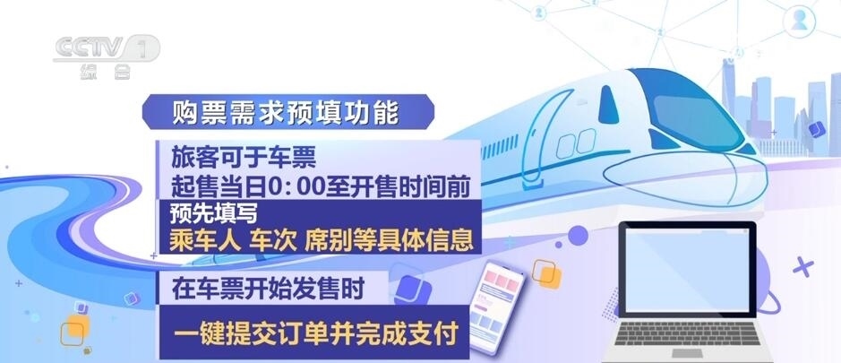 鐵路部門(mén)今年還增加了購(gòu)票需求預(yù)填功能,旅客可于車(chē)票起售當(dāng)日0:00至開(kāi)售時(shí)間前,預(yù)先填寫(xiě)乘車(chē)人、車(chē)次、席別等具體信息,在車(chē)票開(kāi)始發(fā)售時(shí)一鍵提交訂單并完成支付。