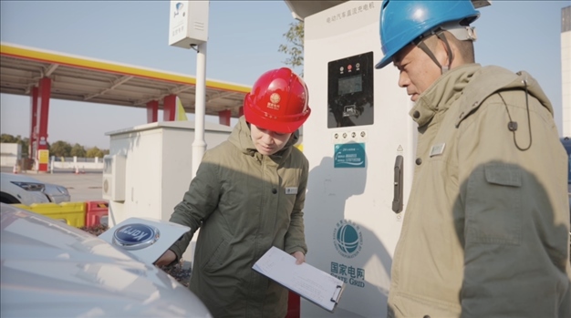 1月26日,在漢孝高速祁家灣服務(wù)區(qū),國網(wǎng)武漢供電公司充換電公共設(shè)施管理有限公司主任工程師張婷(左)和同事在檢查設(shè)施設(shè)備工作狀態(tài)。新華社發(fā)(王欣攝)