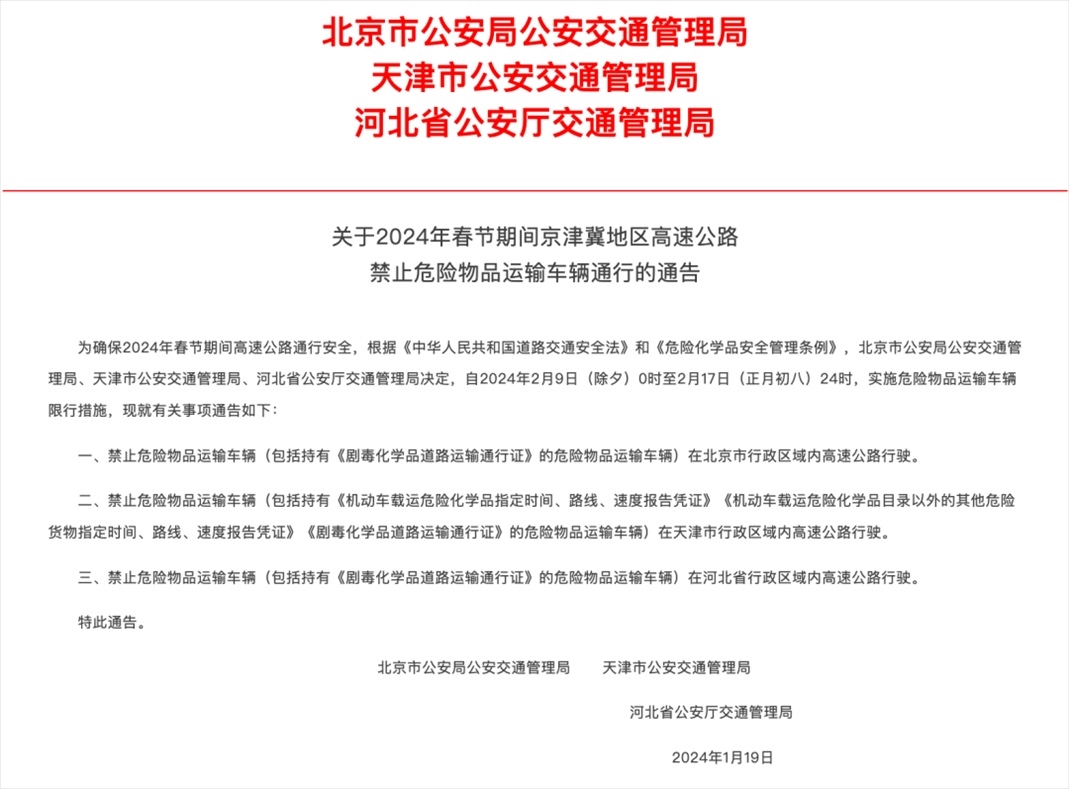 北京市公安局公安交通管理局、天津市公安交通管理局、河北省公安廳交通管理局決定,自2024年2月9日(除夕)0時至2月17日(正月初八)24時,實施危險物品運輸車輛限行措施,現(xiàn)就有關事項通告如下: