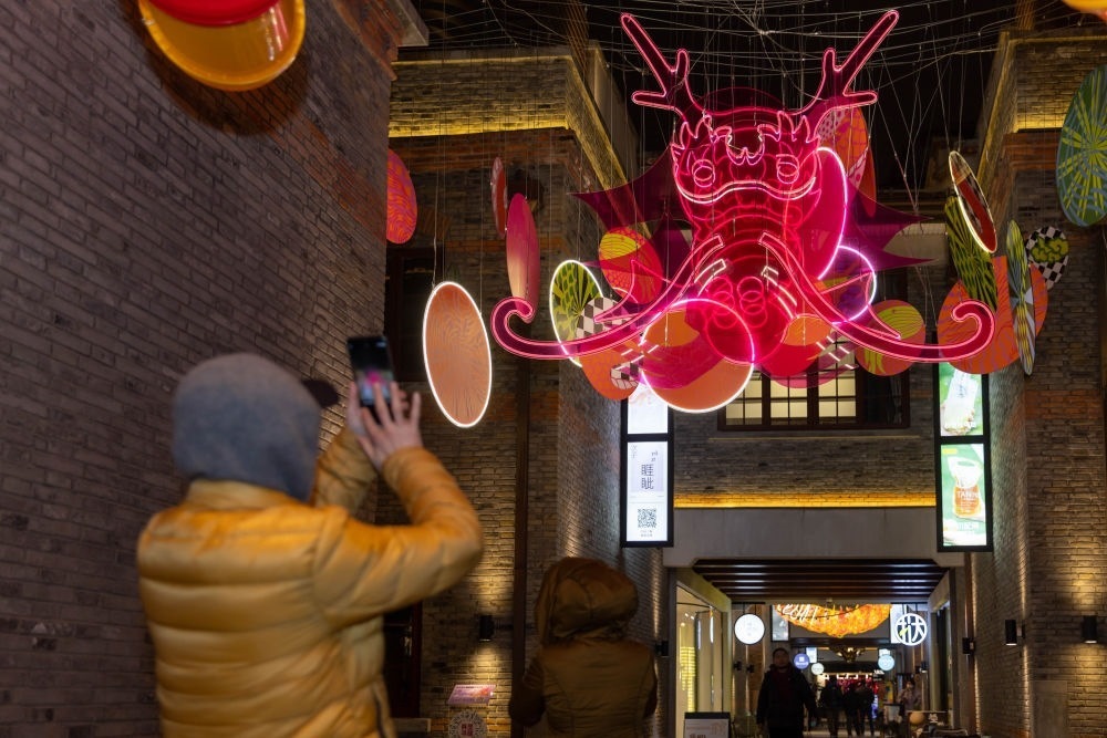 在上海市虹口區(qū)四川北路的“今潮8弄”,人們在龍年燈光藝術(shù)裝置點綴的弄堂中拍照(2024年1月26日攝)。新華社記者 王翔 攝