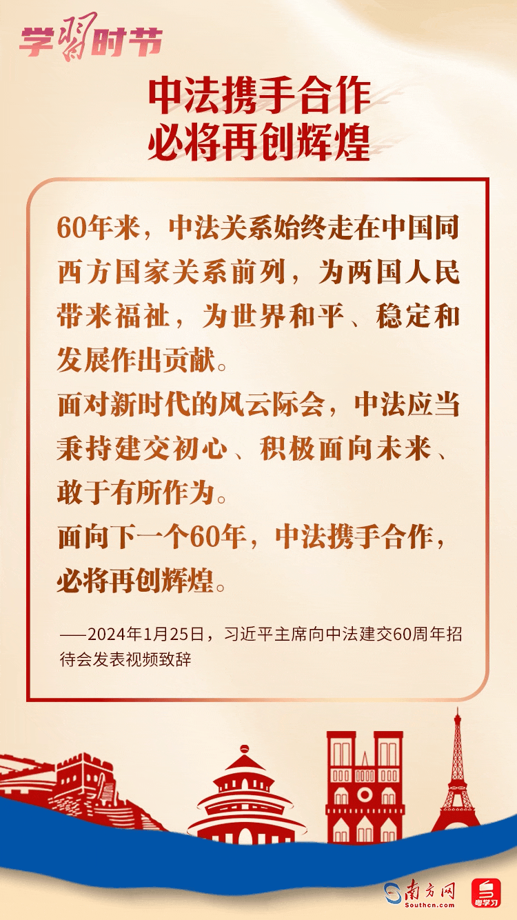 1月27日,國家主席習近平同法國總統(tǒng)馬克龍互致賀電,慶祝兩國建交60周年。習近平主席指出,60年前,中法打破冷戰(zhàn)堅冰、跨越陣營鴻溝,建立大使級外交關系。兩國關系創(chuàng)造多個“第一”、取得豐碩成果,不僅造福于兩國人民,也為維護世界和平穩(wěn)定、促進世界多極化和國際關系民主化發(fā)揮重要作用。