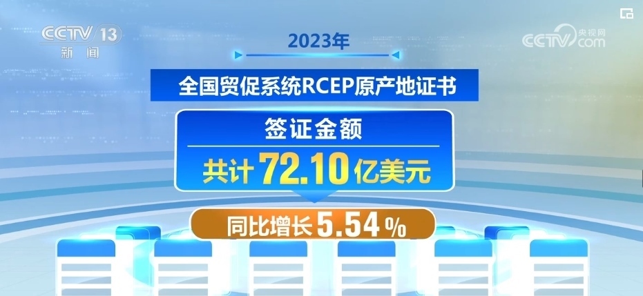 2023年,全國(guó)貿(mào)促系統(tǒng)RCEP原產(chǎn)地證書(shū)簽證金額共計(jì)72.10億美元,同比增長(zhǎng)5.54%;簽證份數(shù)共計(jì)21.81萬(wàn)份,同比增長(zhǎng)38.15%。