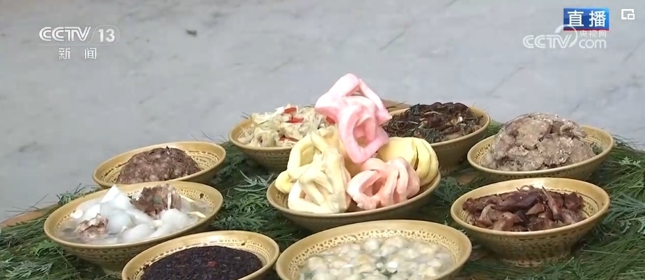 傳統(tǒng)“八大碗”,葷素搭配、香味撲鼻。這個(gè)菜叫做麻脆,是村民們過年的時(shí)候一定要吃上的美味。麻脆由糯米制作而成,不僅有不同的顏色,還可以制作成花鳥魚蟲、蔬菜水果等多種圖案。龍年到來,村里還特別用蔬果做了一條中國龍。