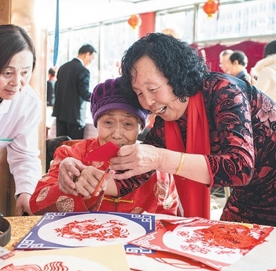 內(nèi)蒙古自治區(qū)呼和浩特市,老人在和養(yǎng)老院志愿者剪窗花。丁根厚攝(影像中國(guó))