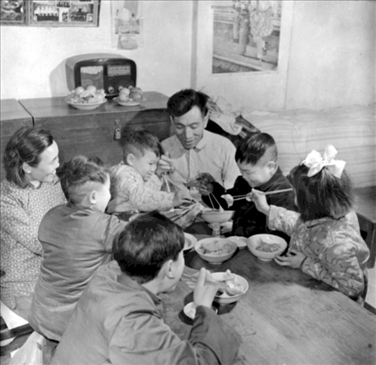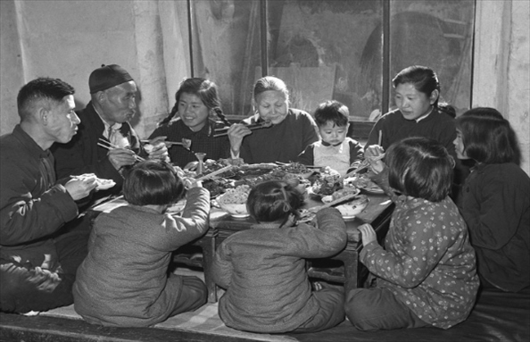 1953年,天津市民王德鑄(左一)一家人吃團(tuán)圓飯。