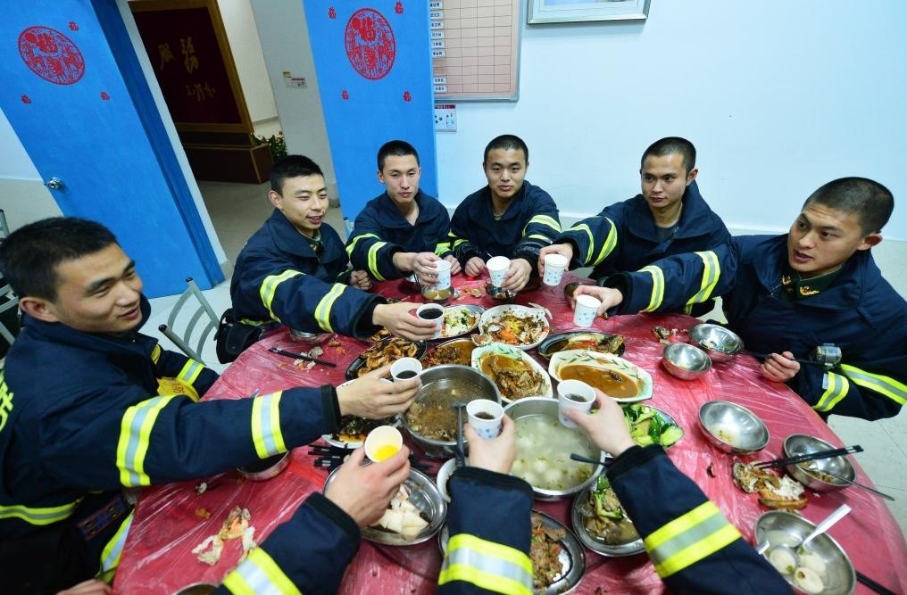 2015年2月18日,福州市鼓樓區(qū)消防大隊(duì)三坊七巷消防中隊(duì)的消防員吃年夜飯。