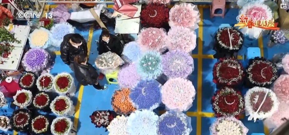 春節(jié)期間五彩繽紛、種類繁多的年宵花成為主角,玫瑰、臘梅、郁金香都是市場(chǎng)“寵兒”。這幾天,周琦他們的日訂單量已經(jīng)從2500單增加到3000多單。