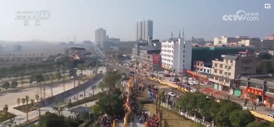 2月10日上午,在廣東韶關(guān)南雄市珠璣古巷,一場(chǎng)盛大的九十九節(jié)龍巡游熱鬧上演。九十九節(jié)龍的龍頭由五種顏色繪制,兩額長(zhǎng)著長(zhǎng)角、兩邊附有魚鱗片,金光閃閃、色彩鮮艷,龍首龍尾還粘有九十九朵長(zhǎng)壽之花。它在珠璣古巷內(nèi)巡游,為父老鄉(xiāng)親祈福,并分別在珠璣牌坊、百姓堂列隊(duì),用龍身擺出“龍年大吉”“天下太平”的新年祝福。