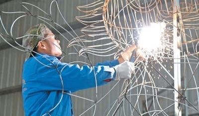 自貢龍騰文化藝術(shù)有限公司生產(chǎn)車間,焊花飛濺,一條中國龍的骨架正在成形。另一側(cè),裱糊工將龍鱗拼貼上色,彩燈漸顯神韻。