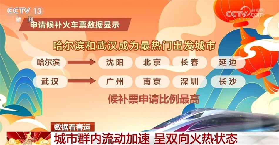 從申請(qǐng)候補(bǔ)火車票的熱門城市看,哈爾濱和武漢延續(xù)昨天的熱度,繼續(xù)成為今天候補(bǔ)票里最熱門的出發(fā)城市,從哈爾濱到沈陽(yáng)、北京、長(zhǎng)春、延邊,從武漢到廣州、南京、深圳、長(zhǎng)沙的候補(bǔ)票的申請(qǐng)比例最高。提醒有候補(bǔ)票需求的旅客,合理安排出行。