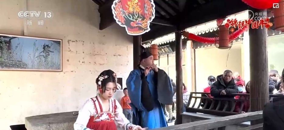 春節(jié)期間,伴隨著陣陣《茉莉花》的悠揚(yáng)樂聲,在江南水鄉(xiāng)黎里古鎮(zhèn)的迎恩坊,游客市民欣賞演奏團(tuán)隊奏響的新年歡樂樂章。石板道兩旁都換上了喜慶的紅色裝飾,糖畫攤、丟圈兒游戲的攤位前擠滿了躍躍欲試的人群。這幾天,黎里古鎮(zhèn)已經(jīng)迎來超過5萬名游客,較2023年同期翻了兩番。