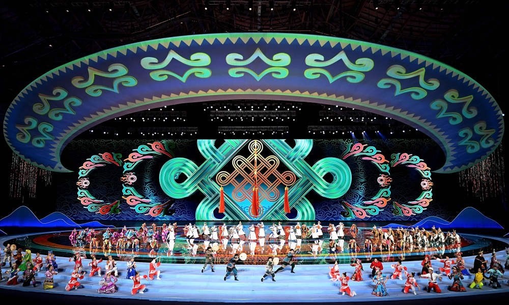 天津年畫、蘇州園林、福建土樓、西藏布達(dá)拉宮……在開幕式的代表團(tuán)入場環(huán)節(jié),各省區(qū)市的人文風(fēng)情和地標(biāo)元素通過剪紙、國潮風(fēng)彩繪等藝術(shù)風(fēng)格展現(xiàn),搭配著《鄂倫春小唱》《美麗的草原我的家》《駿馬奔馳保邊疆》等耳熟能詳?shù)膬?nèi)蒙古音樂,讓觀眾領(lǐng)略到中華民族輝煌璀璨的文化。