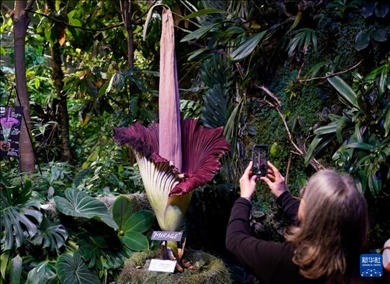 美國舊金山加州科學(xué)博物館內(nèi)一株開花的巨魔芋吸引大批游客觀賞。巨魔芋原產(chǎn)于印度尼西亞蘇門答臘島的熱帶雨林,每隔7至10年開花一次,每次開花時間只有24至36個小時。