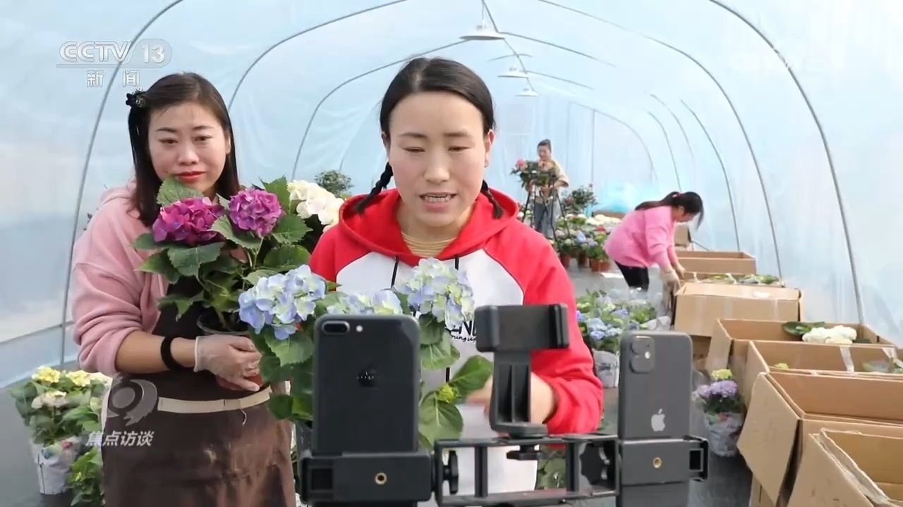 江蘇省宿遷市沭陽縣是全國聞名的“花木之鄉(xiāng)”,也是江蘇省面積最大的花木生產(chǎn)縣。近年來,沭陽進一步完善“互聯(lián)網(wǎng)+三農(nóng)”模式,依托本地花木特色優(yōu)勢和電商先發(fā)優(yōu)勢,持續(xù)壯大花木電商,推動產(chǎn)業(yè)迭代升級。每天晚上,走進沭陽縣新河鎮(zhèn)主播之家的盆景基地,都能看到一片熱鬧的場景。臺上一名拍賣師,臺下五十多名網(wǎng)絡主播同時直播,一邊與粉絲互動,一邊幫忙喊價。在沭陽的各個溫室大棚,也經(jīng)常能看到農(nóng)戶在帶貨直播,在這里,手機變身為“新農(nóng)具”、直播變成了“新農(nóng)活”。