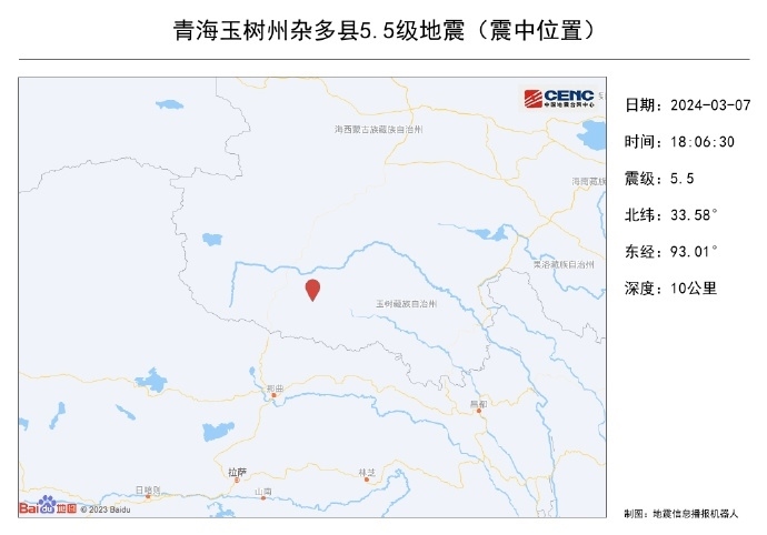 央視網消息:中國地震臺網正式測定:03月07日18時06分在青海玉樹州雜多縣(北緯33.58度,東經93.01度)發(fā)生5.5級地震,震源深度10千米。據(jù)地震人口熱力圖數(shù)據(jù),震中周邊屬于高原無人區(qū),目前也暫未收到震感反饋。此次震中距離最近的西藏聶榮縣城177公里、距青海雜多縣城227公里,震中5公里范圍內平均海拔約4809米。