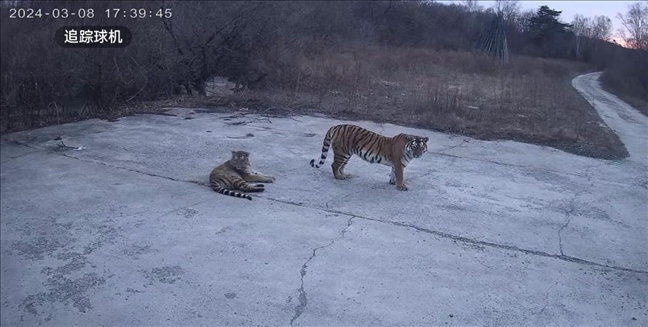 ·吉林延邊四只東北虎在魚塘旁游蕩,當(dāng)?shù)兀阂淹ㄖ迕褡⒁狻?/span>