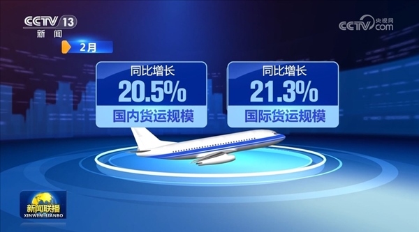 貨運(yùn)方面,2月,全行業(yè)完成貨郵運(yùn)輸量54.6萬(wàn)噸,同比增長(zhǎng)20.8%。其中,國(guó)內(nèi)、國(guó)際貨運(yùn)規(guī)模同比分別增長(zhǎng)20.5%、21.3%。1—2月貨郵運(yùn)輸量達(dá)到歷年開(kāi)年前兩月最高值。