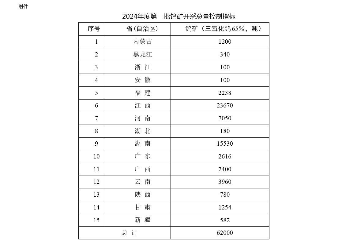 央視網(wǎng)消息:據(jù)自然資源部消息,自然資源部發(fā)布關(guān)于下達2024年度鎢礦開采總量控制指標(第一批)的通知,2024年度第一批鎢礦(三氧化鎢含量65%,下同)開采總量控制指標62000噸。鎢礦開采總量控制指標不再區(qū)分主采指標和綜合利用指標。對采礦許可證登記開采主礦種為其他礦種、共伴生鎢礦的礦山,查明鎢資源量為大中型的,繼續(xù)下達開采總量控制指標,并在分配上予以傾斜。對共伴生鎢資源量為小型的,不再下達開采總量控制指標,由礦山企業(yè)向所在地省級自然資源主管部門報備鎢礦產(chǎn)量。具體如下: