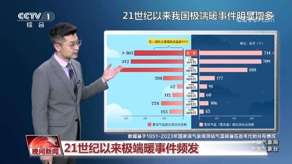氣象分析師 胡嘯:我們統(tǒng)計了上世紀50年代以來氣溫創(chuàng)紀錄的站點,從白天的國家級氣象站創(chuàng)紀錄站點來看,有百分之七十都出現(xiàn)在21世紀,近三年數(shù)量達到了503個,在這其中有六成站點的極端最高氣溫都突破了40℃。不僅白天的氣溫高,夜間的氣溫也很高,大致有百分之八十的站點都出現(xiàn)在21世紀。近三年是達到了714個,這要比以往任何十年的累加都要多。
