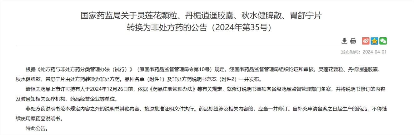 央視網(wǎng)消息:日前國(guó)家藥監(jiān)局網(wǎng)站發(fā)布公告,根據(jù)《處方藥與非處方藥分類(lèi)管理辦法(試行)》(原國(guó)家藥品監(jiān)督管理局令第10號(hào))規(guī)定,經(jīng)國(guó)家藥品監(jiān)督管理局組織論證和審核,靈蓮花顆粒、丹梔逍遙膠囊、秋水健脾散、胃舒寧片由處方藥轉(zhuǎn)換為非處方藥。