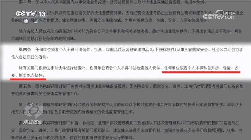 國務院頒布的《快遞暫行條例》第四條明確規(guī)定:“任何單位或者個人不得私自開拆、隱匿、毀棄、倒賣他人快件。”