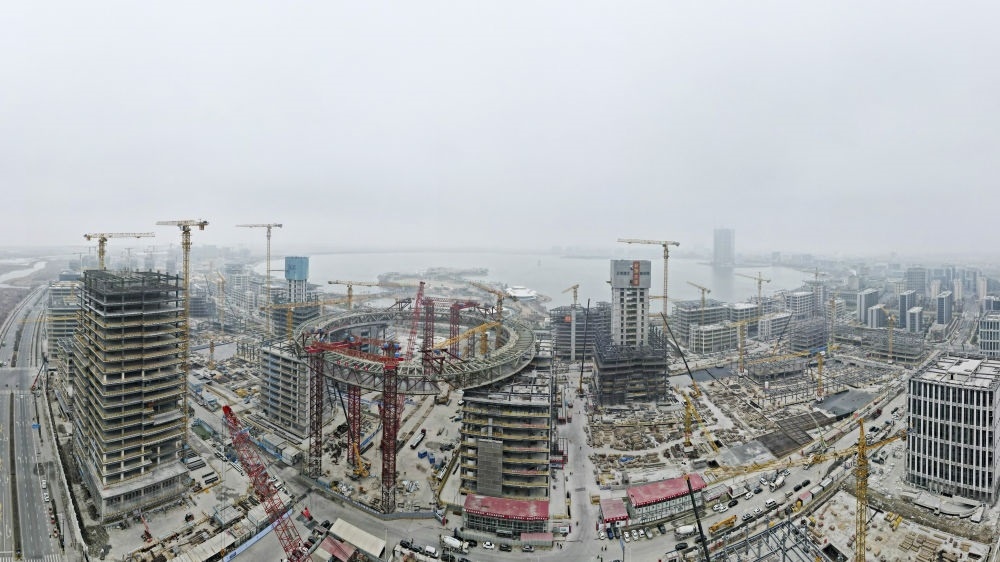 空中俯瞰建設(shè)中的上海臨港新片區(qū)滴水湖金融灣項(xiàng)目(2024年1月18日攝,無(wú)人機(jī)全景照片)。新華社記者 方喆 攝