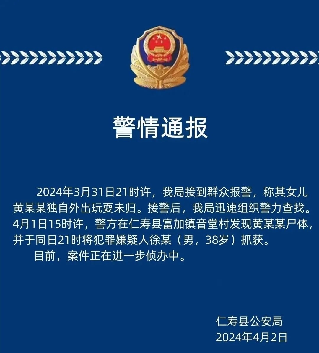 ·警方通報(bào)四川仁壽11歲女孩失蹤遇害:發(fā)現(xiàn)尸體,同日抓獲38歲嫌疑人。