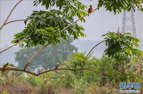 兩只鸛嘴翡翠同框 (4月2日攝)。新華網發(fā)(沙永勝 攝)