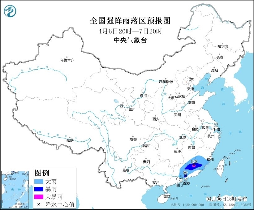 預計,4月6日20時至7日20時,江西南部、福建中南部、廣東中東部等地的部分地區(qū)有大到暴雨,其中,江西南部、福建南部、廣東東北部等地局地有大暴雨(100~120毫米)。上述部分地區(qū)伴有短時強降水(最大小時降雨量20~40毫米,局地可超過50毫米),局地有雷暴大風或冰雹等強對流天氣。