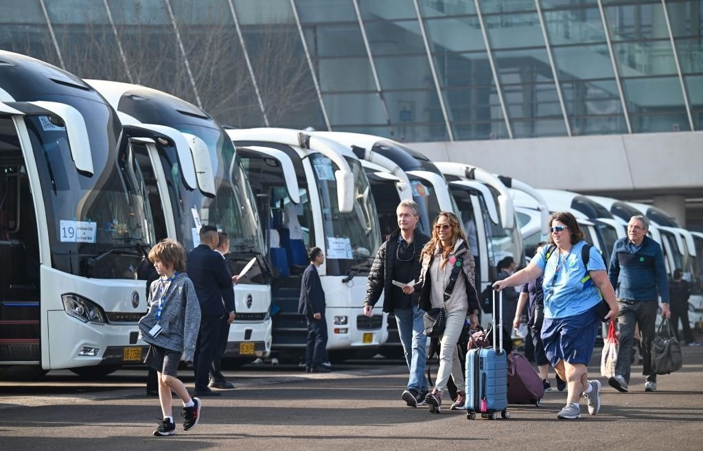 4月7日,外籍旅客準(zhǔn)備搭乘大巴車(chē)前往京津旅游景點(diǎn)。新華社記者 孫凡越 攝