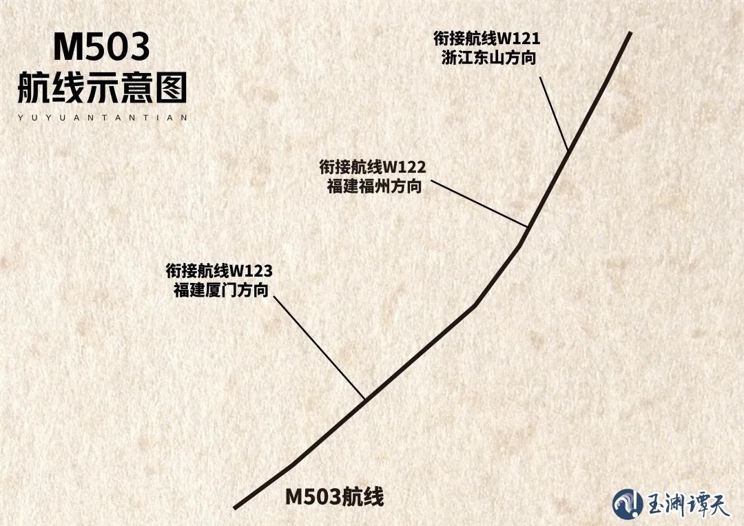 這樣的背景下,在經(jīng)過國際民航組織(ICAO)核準后,這條代碼為M503的新航線正式落地,與之相配套的還有三條銜接航線,即飛往浙江東山的W121、飛往福建福州的W122和飛往福建廈門的W123。