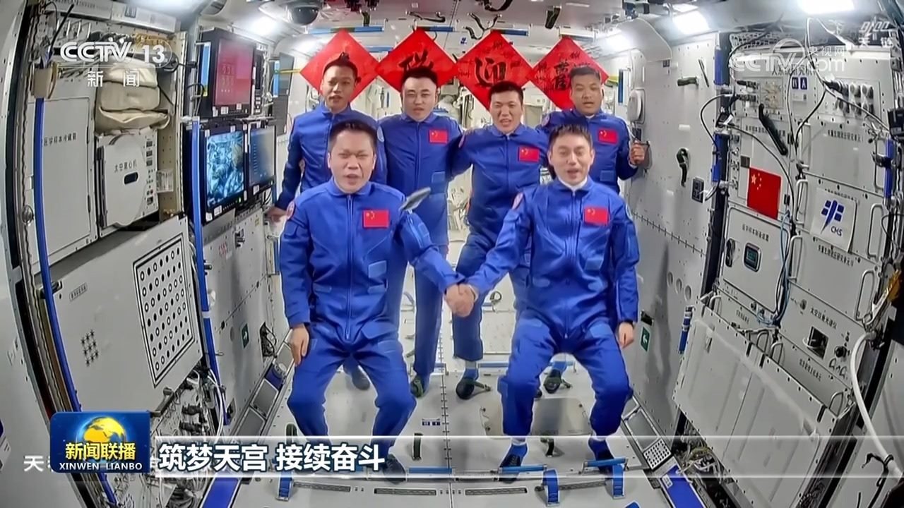 5時04分,在軌執(zhí)行任務(wù)的神舟十七號航天員乘組順利打開“家門”,歡迎遠道而來的神舟十八號航天員乘組入駐“天宮”。