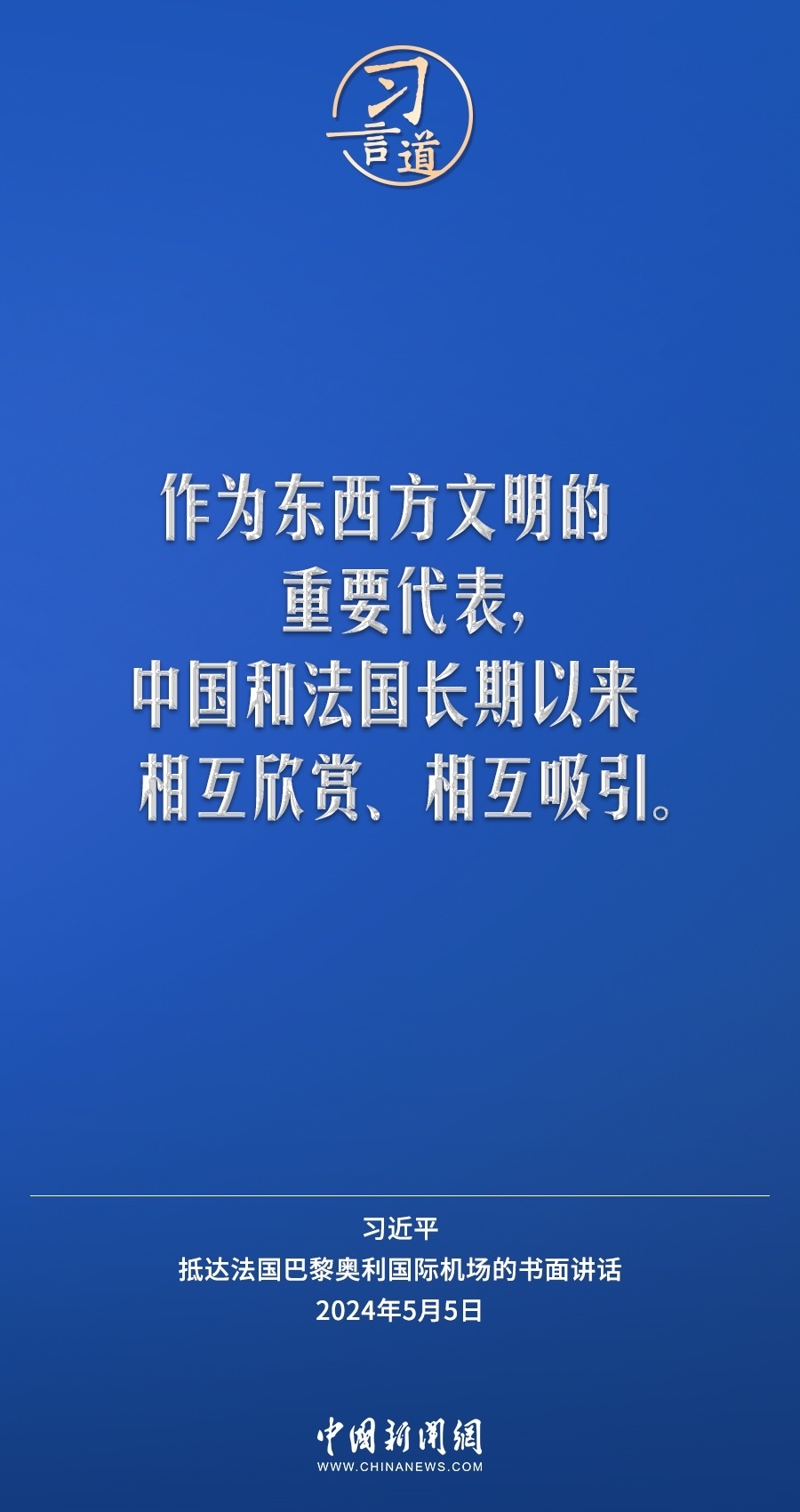 當(dāng)?shù)貢r(shí)間5月5日下午,國(guó)家主席習(xí)近平抵達(dá)巴黎,開(kāi)始對(duì)法國(guó)進(jìn)行國(guó)事訪問(wèn)。在抵達(dá)法國(guó)巴黎奧利國(guó)際機(jī)場(chǎng)的書(shū)面講話(huà)中,習(xí)近平指出——