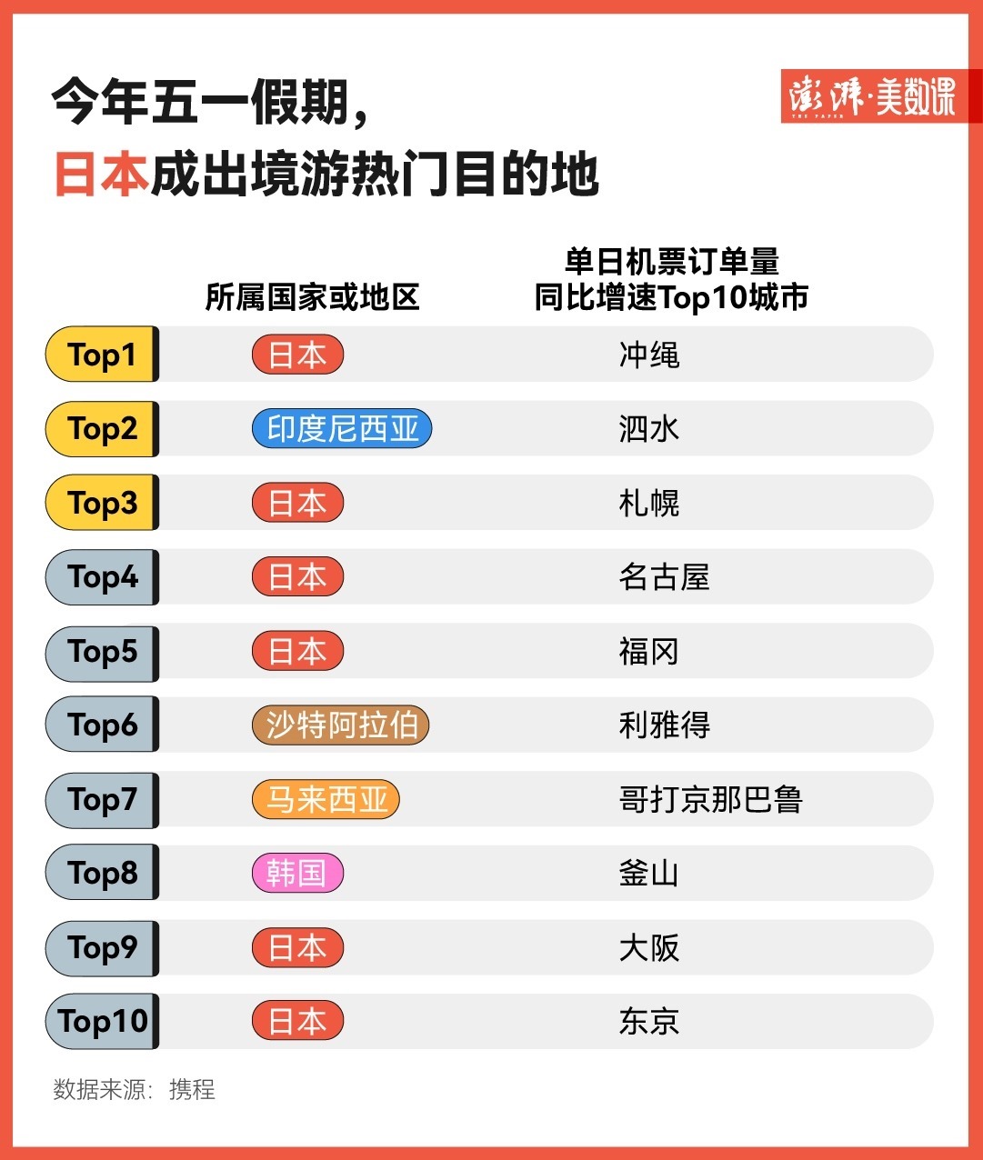除了國(guó)內(nèi)旅游市場(chǎng)的火爆之外,“五一”出境游已經(jīng)加快復(fù)蘇。從攜程提供的數(shù)據(jù)看,今年“五一”假期,日本成了出境游熱門目的地——相比2023年同期,單日機(jī)票訂單量同比增速Top10的城市中,日本的沖繩、札幌、名古屋等城市分別占據(jù)了六個(gè)席位。