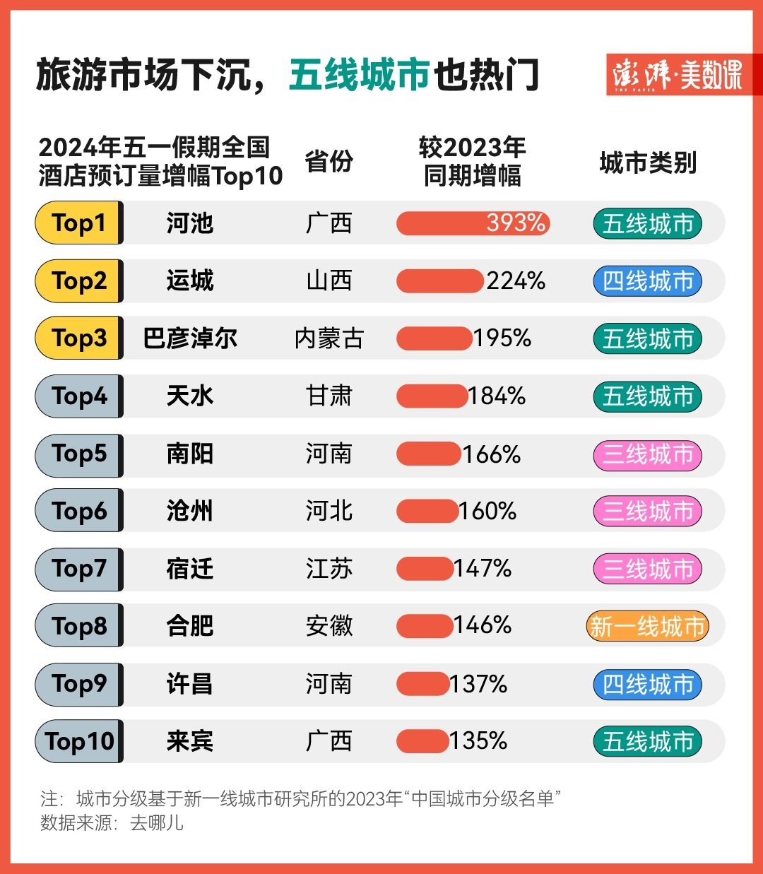 從去哪兒的數(shù)據(jù)來(lái)看,這個(gè)假期里酒店預(yù)訂量增幅前十名的城市幾乎都是三線、四線或五線城市,其中五線城市河池以393%的同比增幅領(lǐng)跑全國(guó),其次是山西運(yùn)城、內(nèi)蒙古巴彥淖爾。