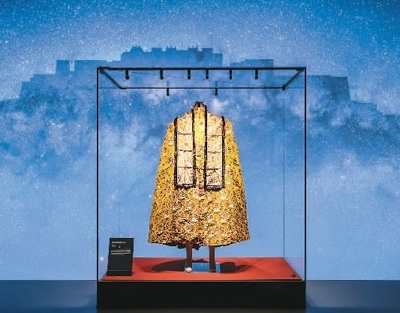 走進展廳,在星空璀璨的布達拉宮夜景映襯下,一件金燦燦的斗篷格外引人注目。斗篷是西藏地區(qū)常見的服裝,根據(jù)場合和穿著對象的不同,斗篷的式樣和用料均有所差別。這件金寶地花卉紋斗篷通長170厘米,黃綢緞上繡滿了花紋圖案,并鑲有多種珠寶,衣領(lǐng)上縫有獺皮,背后繡有云龍紋,可想而知穿著者身份之顯赫。此次展覽是它首次公開展出。
