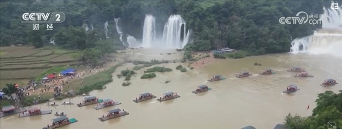 水量大增的瀑布奔騰而下沖擊著河面水聲轟鳴,慕名前來的游客們或乘坐竹筏感受瀑布的恢弘氣勢,或?qū)ふ易罴褭C位與瀑布“打卡”合影。除了近距離觀賞德天跨國瀑布,也有不少游客選擇跨境游玩,站在越南境內(nèi)的板約瀑布看德天瀑布,以不同視角體驗中越風(fēng)情。