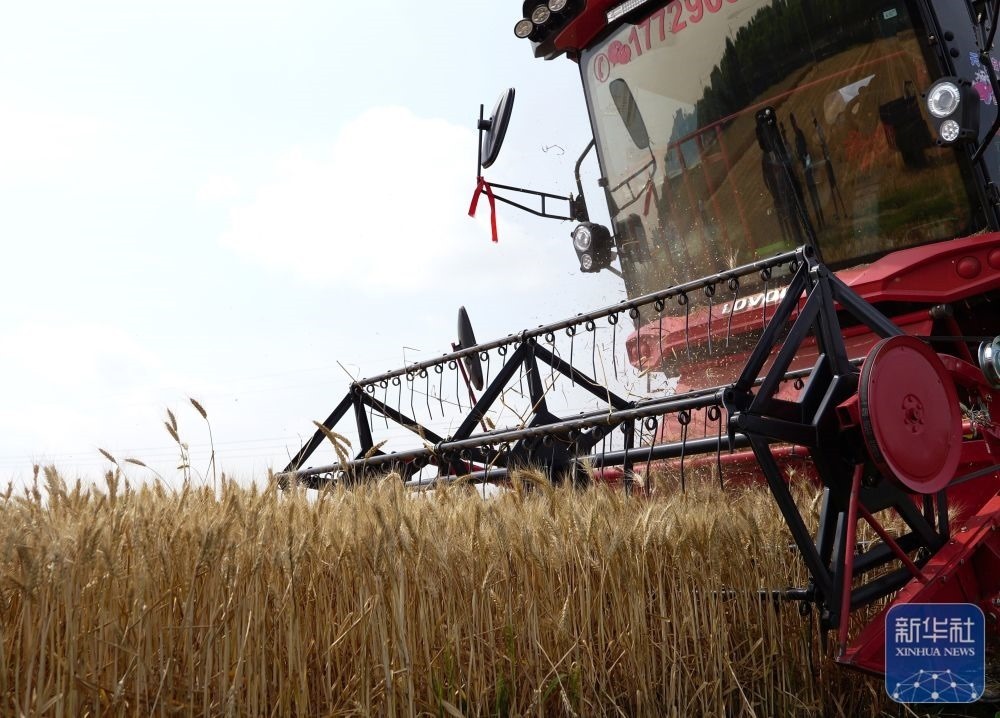 5月26日,農民駕駛收割機在河南省寶豐縣鬧店鎮(zhèn)鬧店村麥田里收割小麥。新華社發(fā)(何五昌攝)