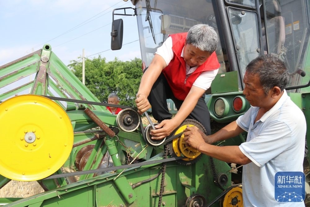 5月26日,在河南省南陽市內鄉(xiāng)縣大橋鄉(xiāng),農機服務人員(右二)為跨區(qū)作業(yè)的農機手提供免費機修服務。新華社發(fā)(張中立攝)