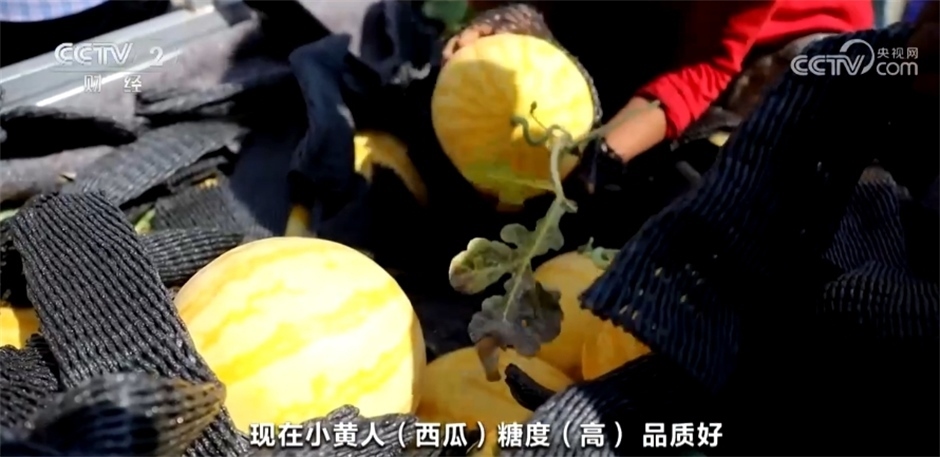 西瓜收購商稱:“我今天來這兒收小黃人西瓜,發(fā)往鄭州、北京、上海,各個大城市都發(fā)?,F(xiàn)在,小黃人西瓜糖度高、品質(zhì)好。