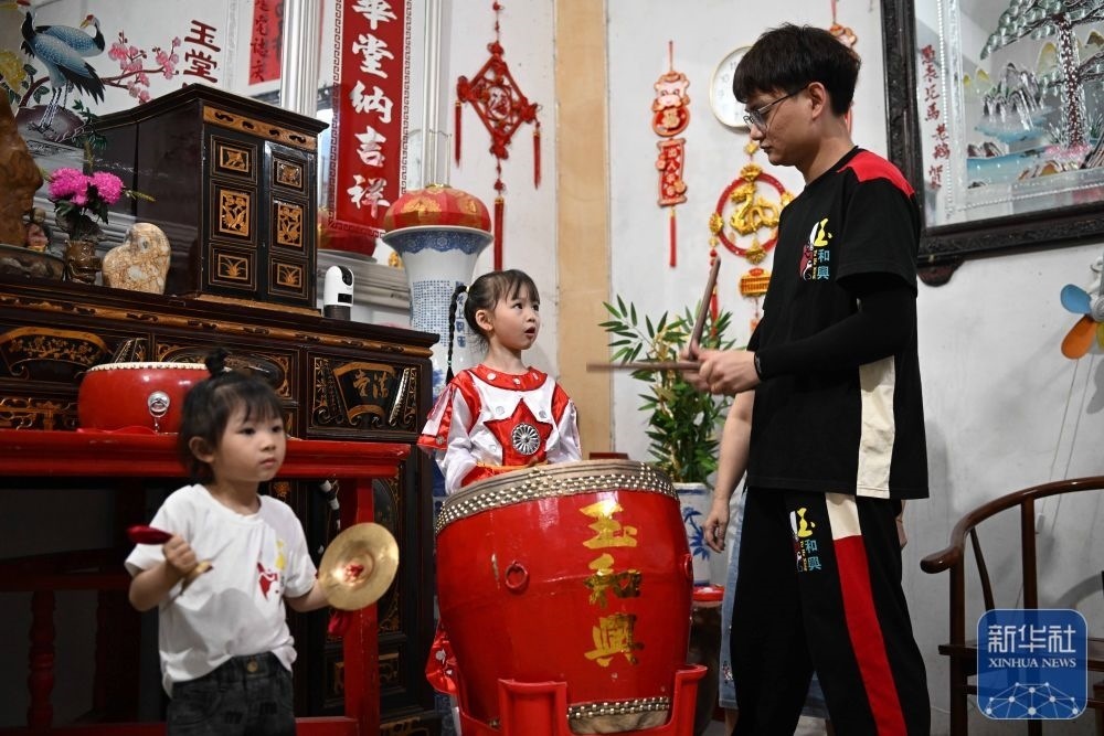 5月29日,在汕頭市貴嶼鎮(zhèn)玉窖村的家中,父親莊镕強(qiáng)(右)指導(dǎo)莊恩琪(中)和妹妹莊雅琪練習(xí)“敲鑼打鼓”。