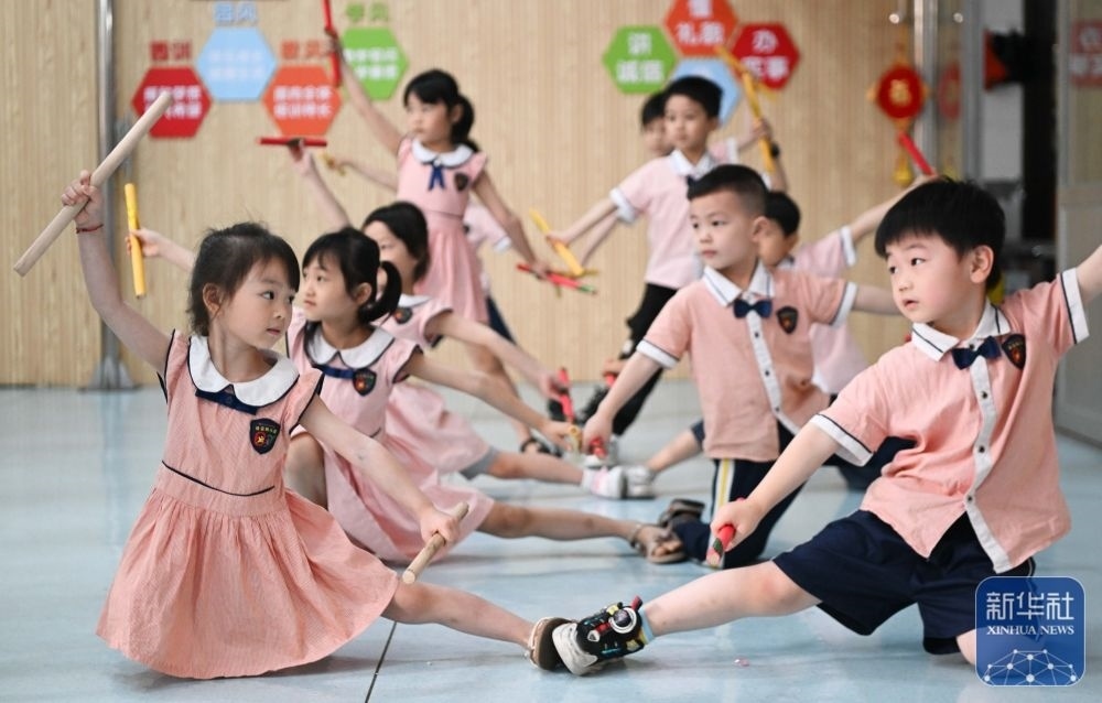 5月29日,在汕頭市貴嶼鎮(zhèn)北林保嬰幼兒園,莊恩琪(前左)在練習(xí)跳英歌舞。
