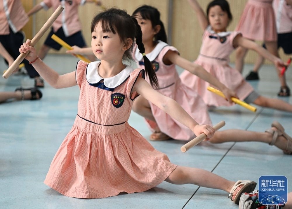 5月29日,在汕頭市貴嶼鎮(zhèn)北林保嬰幼兒園,莊恩琪練習(xí)跳英歌舞。
